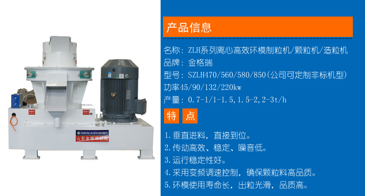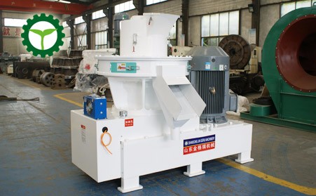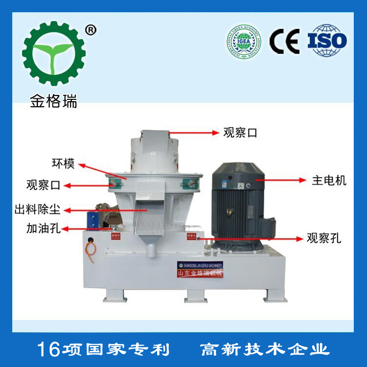 工作時生物質木屑原料由進料口垂直落入,經過壓輪的旋轉使物料連續均布在模具內腔表麵(壓輥與模具的接觸立麵),在壓輥的碾壓下粉狀物料穿過模具的孔(均布在模具內表麵的孔)。此過程物料受到高壓、高溫的作用,產生物理變化或適當的化學變化(根據物料),促使粉狀物料形成不斷加長的圓柱狀實心體,再由斷刀切斷顆粒,從出料口排出,至此顆粒的壓製過程完成。